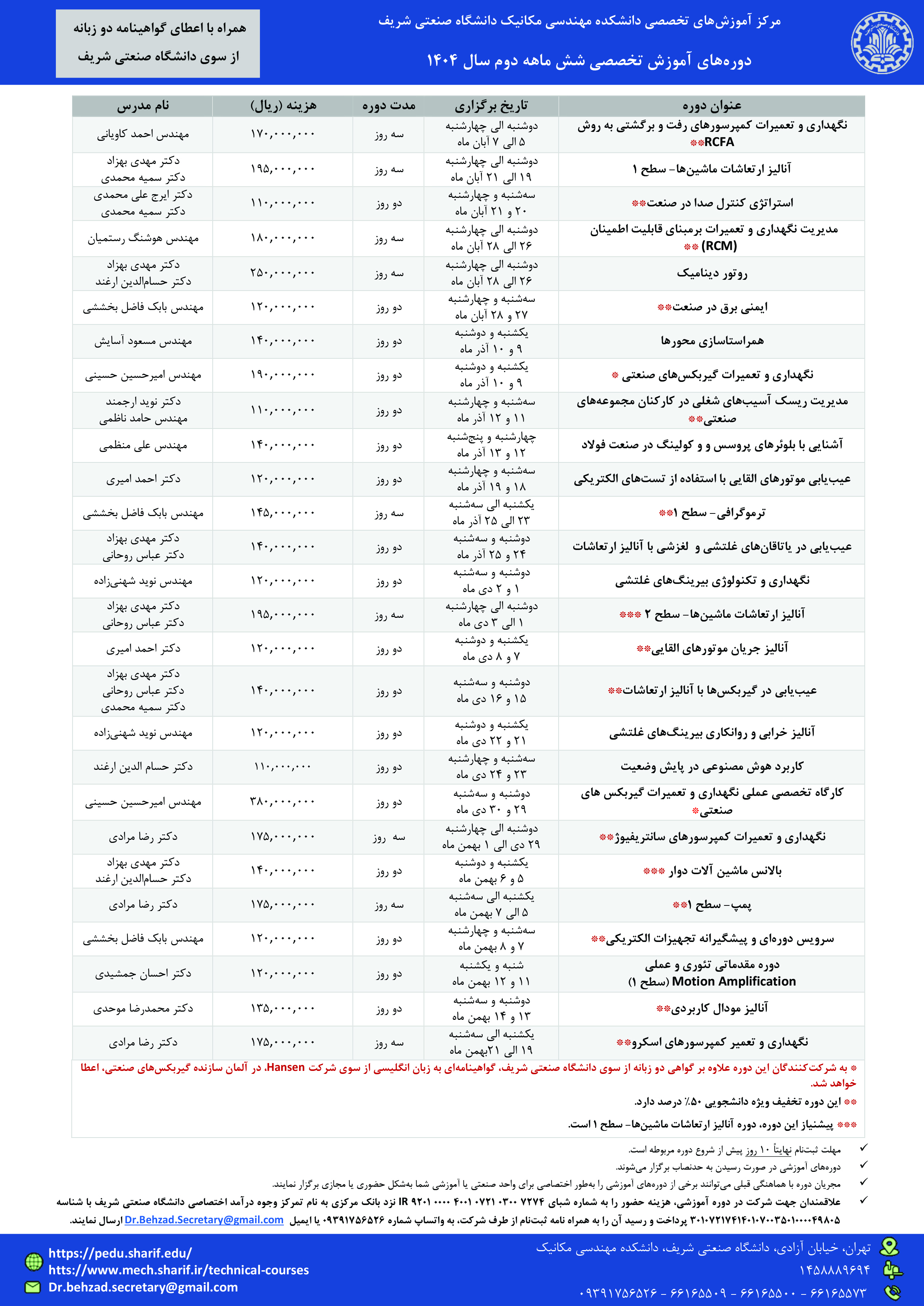 باسلام تاریخ ارسال مقالات نوزدهمین کنفرانس مرکز پایش وضعیت 1404/06/01 الی 1404/09/29 ، ثبت نام از طریق شماره تماس های زیر از تاریخ 1404/06/01 الی 1404/11/25 انجام دهید و اعلام نتیجه داوری مقالات 1404/11/01 می باشد. 09391756726 02166165500-5573 با تشکر دبیر خانه کنفرانس مرکز پایش وضعیت و عیب یابی دانشگاه شریف